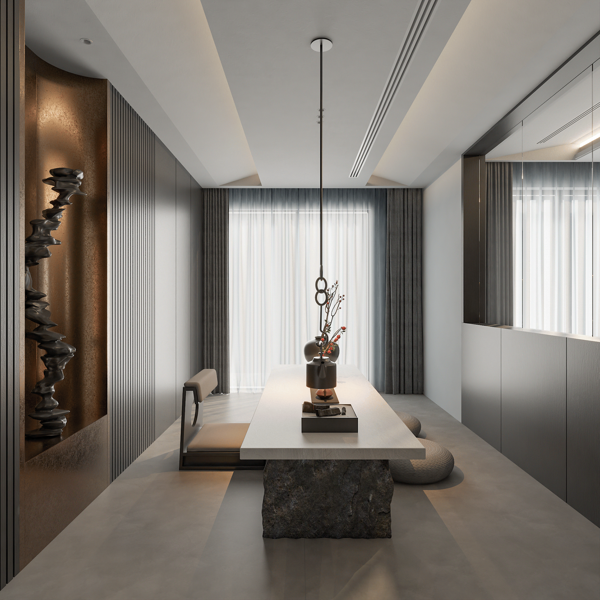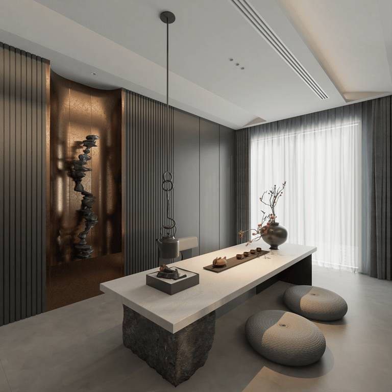 The tea room is the heart of the home. Not a feature, not a showpiece — a room designed for the daily ritual of sitting, pouring, and doing nothing else. It is the one space in the apartment that asks something of you: to be here, fully.