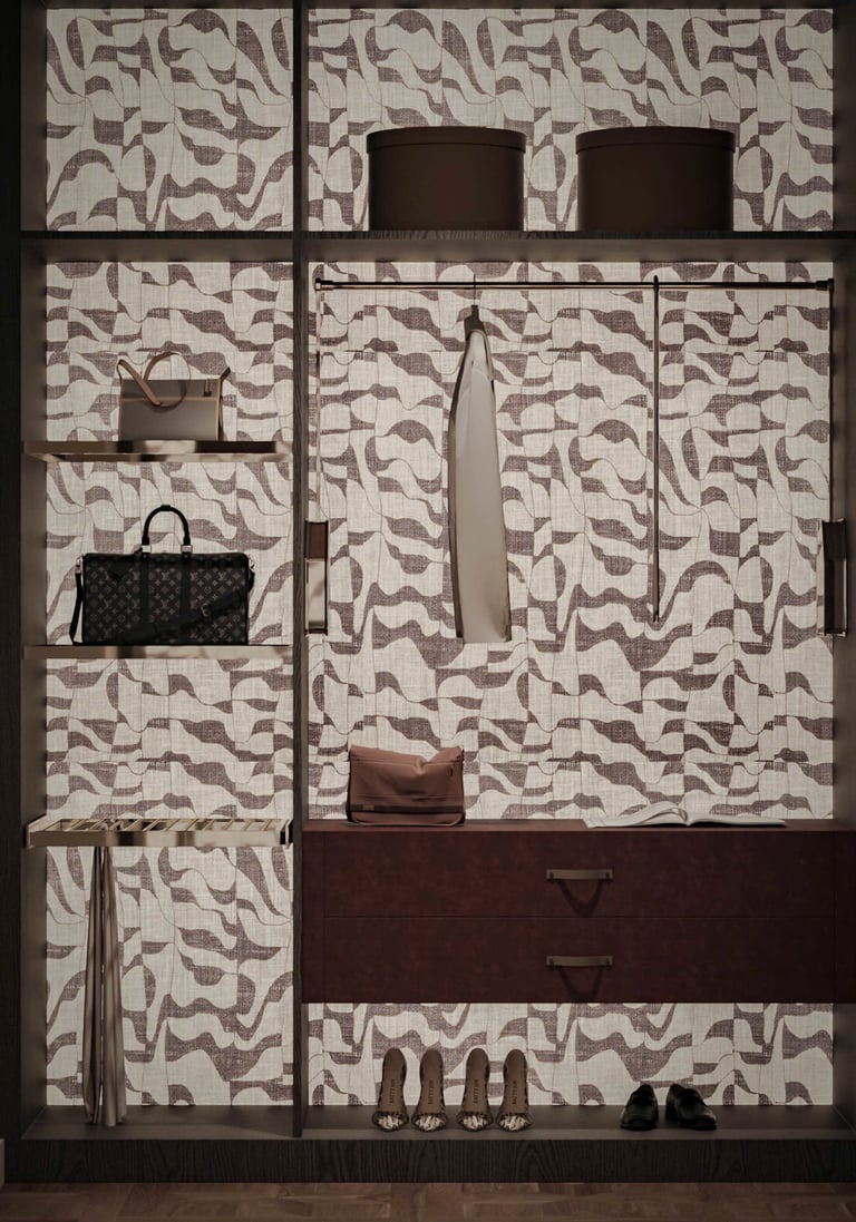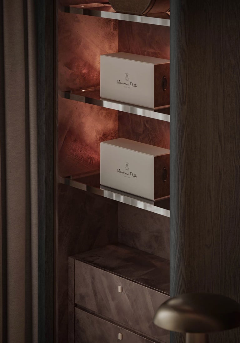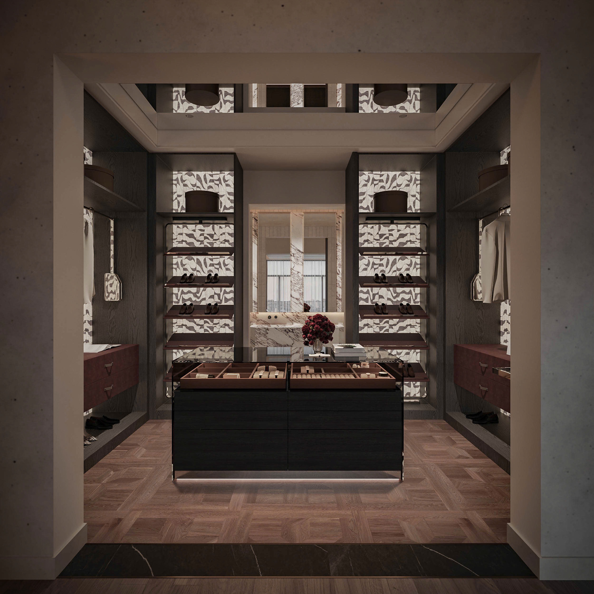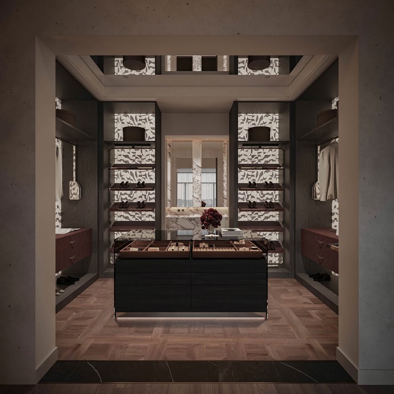 The walk-in wardrobe was conceived as a boutique in its own right. Bespoke shelving with patterned fabric back panels, a central island with integrated jewellery drawers, and full-height display niches illuminate the client's curated collection. Every rail, every drawer, every proportion was drawn to specification — nothing off-the-shelf, nothing repeated.