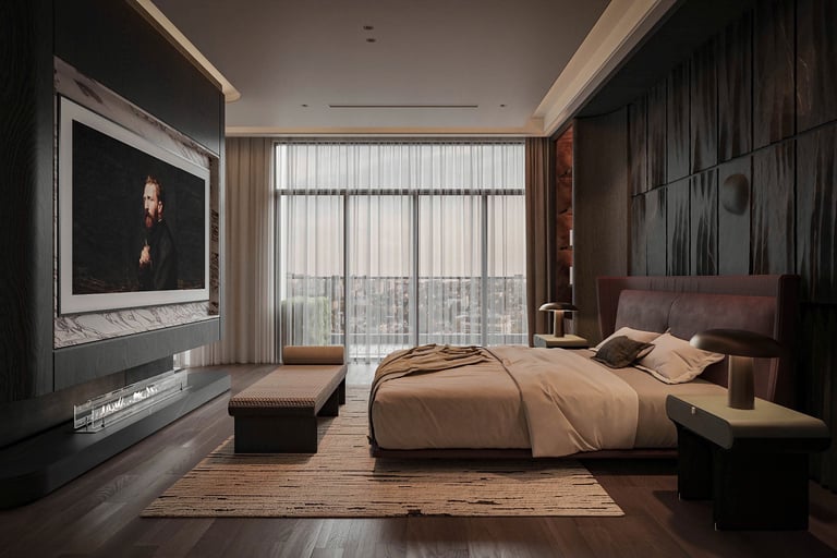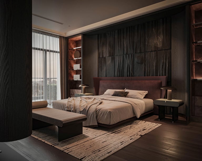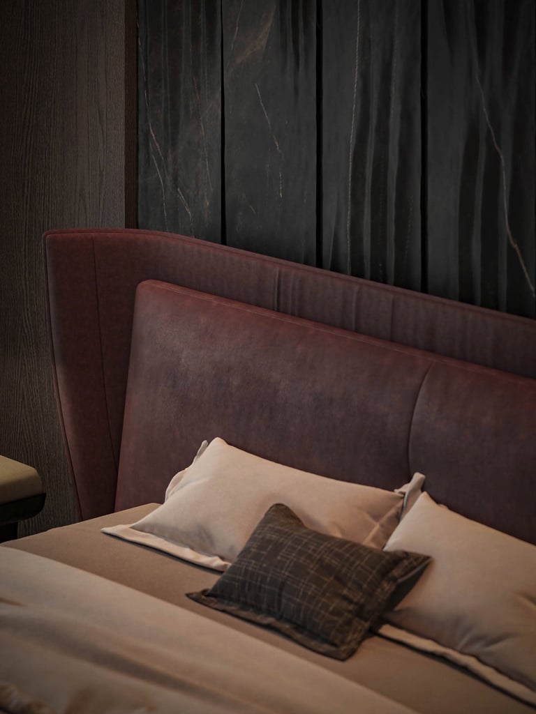 The bedroom is wrapped in hand-selected materials: genuine leather wall panels in deep burgundy anchor the headboard wall, while smoked timber veneer joinery lines every surface with quiet authority. Copper detailing — in handles, shelf edges, and bedside hardware — runs as a warm thread throughout, catching light differently at every hour of the day.