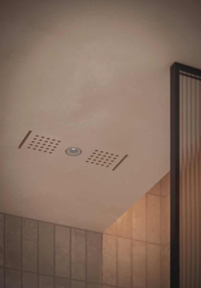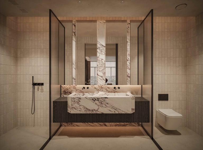The ensuite continues the language of considered luxury. A concealed rain shower sits behind floor-to-ceiling stone panels, revealing itself only when you know where to look. Marble detailing, recessed mirrors, and a palette of warm cream and dark bronze create a bathroom that feels closer to a private spa than a functional room.
